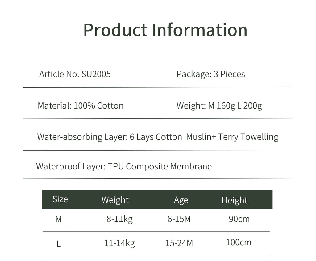 - Use Cases: Potty training pants, reusable toddler nappies, waterproof baby underwear, eco-friendly diapering, early toilet learning