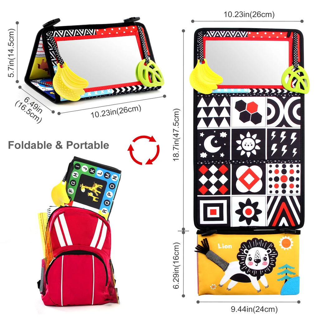 Featuring high-contrast black and white patterns, it stimulates visual tracking and curiosity. The large mirror encourages self-recognition and playful expressions, while the included teether provides relief during teething. Lightweight and foldable, it’s easy to carry or attach to a crib or car headrest, making it ideal for on-the-go entertainment and brain development.